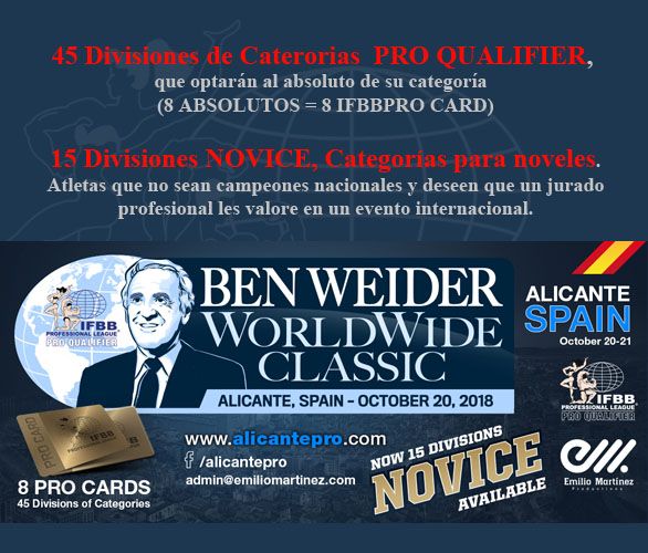 Como novedad, este año se presenta en España, la posibilidad de poder competir a los NOVELES, nuestros deportistas que están comenzando y no tienen aun el recorrido ni el nivel para poder optar por una tarjeta IFBB PRO, pero les encantaría de poder competir en el mismo escenario que competirán los que serán profesionales o los mismos profesionales que competirán el IFBB ALICANTE PRO 2018.