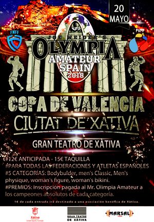 En un marco incomparable, el "Gran Teatre de Xàtiva". Por primera vez en este municipio podremos albergar nuestro mejor espectáculo de Culturismo de nuestra territorial, abierto a todos los atletas del país que quieran lograr tener su pase al MR. OLYMPIA AMATEUR SPAIN 2018.