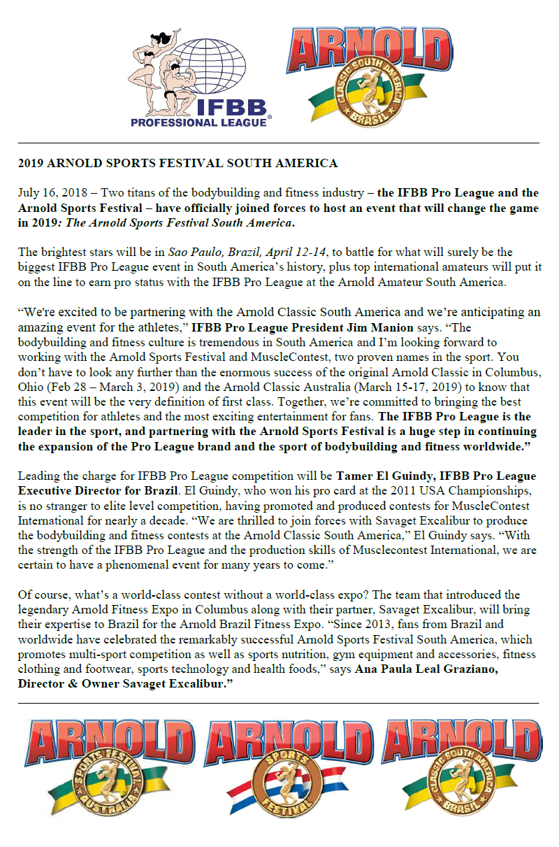 Como publicamos hace unos días, ya es oficial para el próximo año que Arnold Sport Festival Sur America estará en bajo la tutela de la IFBB PRO LEAGUE.