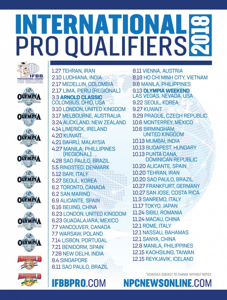2018 es también el primer año innovador del nuevo sistema PRO QUALIFIER de la IFBB Pro League, con  56 competencias internacionales AMATEUR en todo el mundo  .