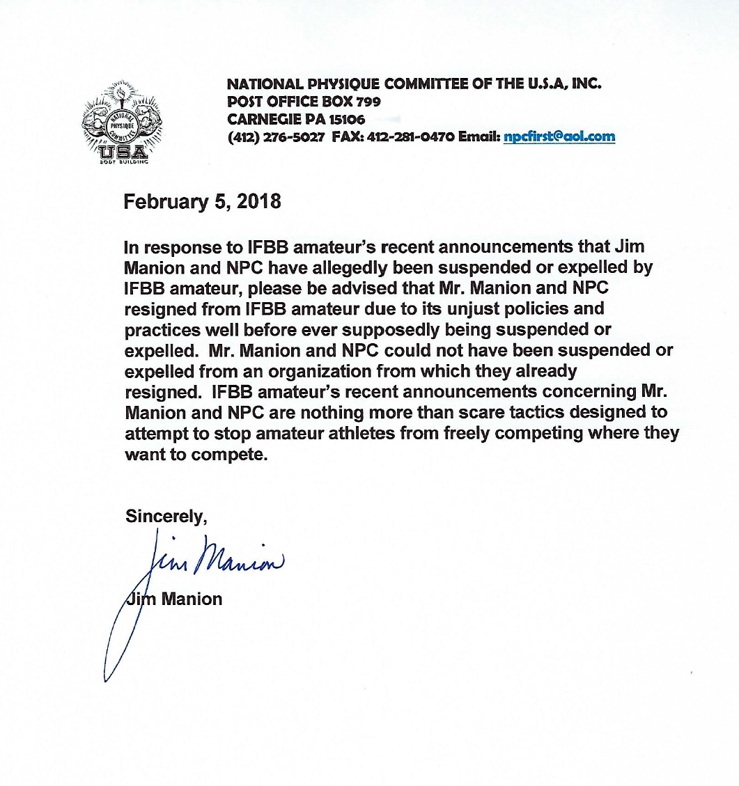 Anuncio oficial del señor Jim Manion y la NPC, aclarando las dudas respecto a las supuestas sanciones que la Ifbb. Aficionado prodigo al mundo.